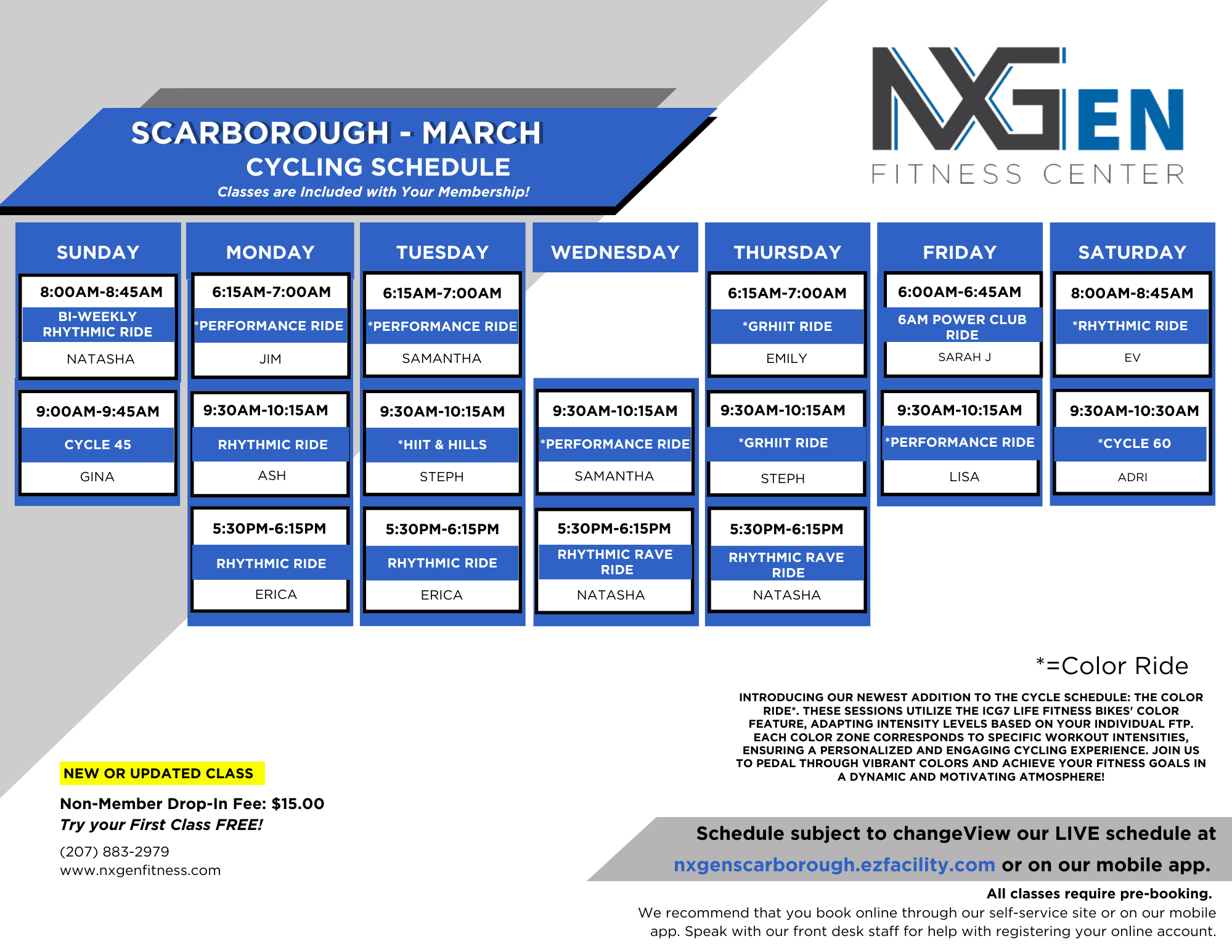 SCARBOROUGH CYCLING SCHEDULEALL CLASSES ARE INCLUDED IN YOUR MEMBERSHIPNON-MEMBER DROP IN RATES:Non-Member Single Class - $15.00