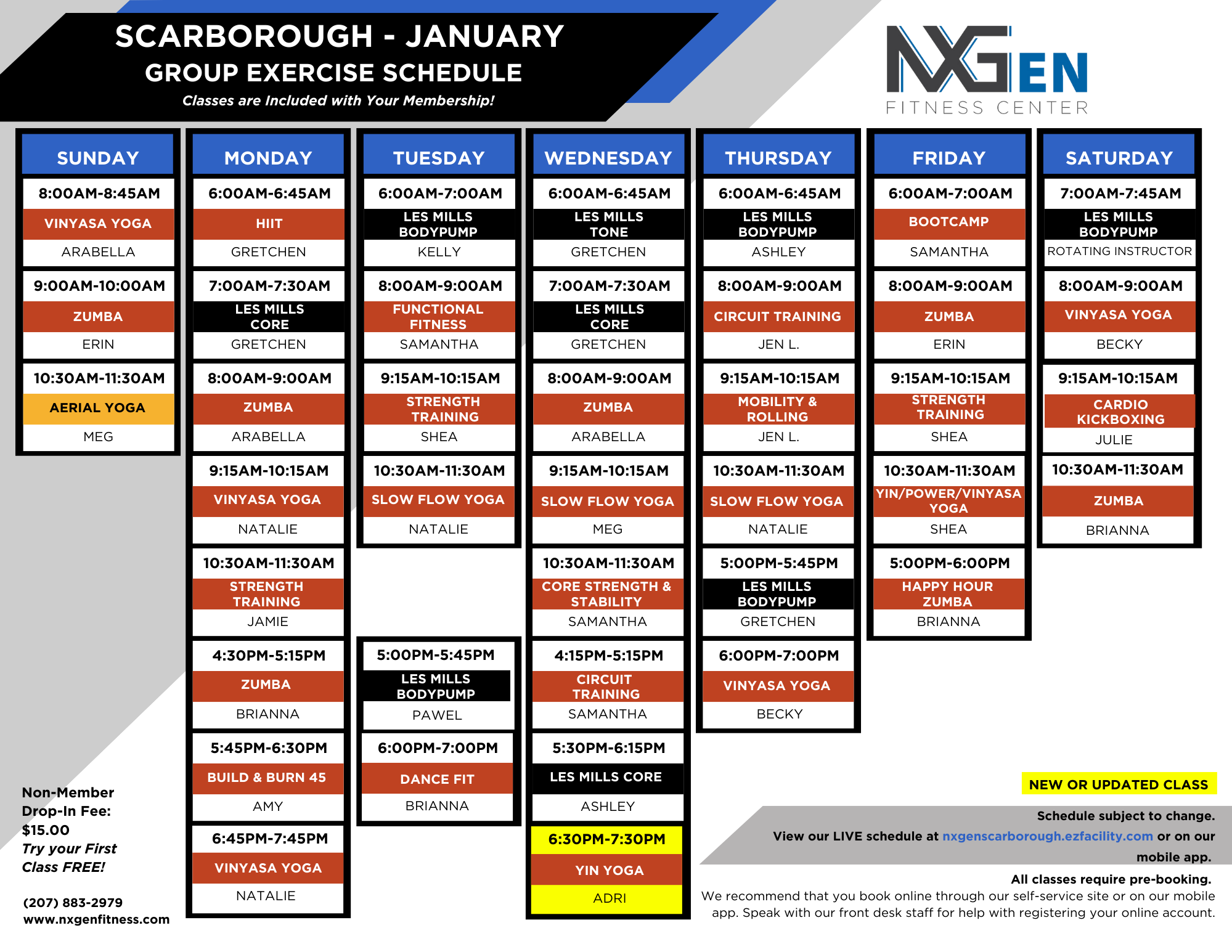 SCARBOROUGH GROUP CLASS SCHEDULEALL CLASSES ARE INCLUDED WITH MEMBERSHIPNON-MEMBER DROP IN RATES:Non-Member Single Class - $15.00